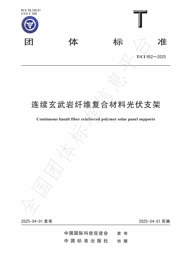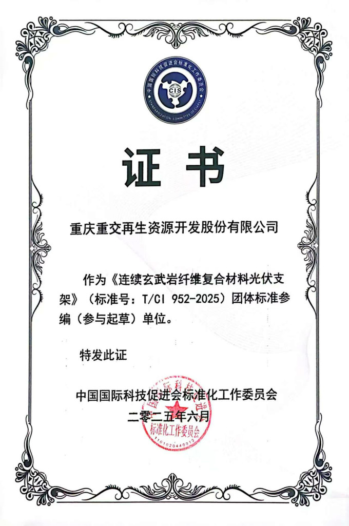 近日,由中国国际科技促进会发布的团体标准《连续玄武岩纤维复合材料光伏支架》(T/CI 952-2025)正式实施。重庆重交再生资源开发股份有限公司作为重要参编单位之一,深度参与了该标准的起草与制定工作。